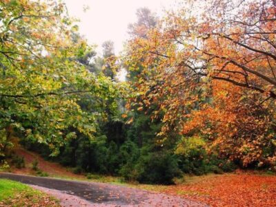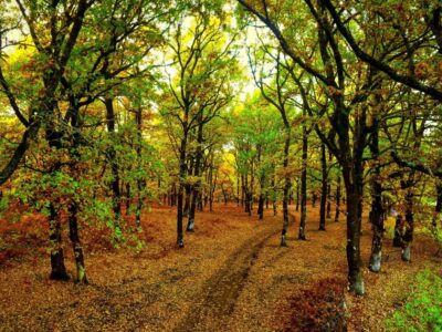 Μια πινακίδα πριν το δάσος υπενθυμίζει τον «τόπο του Φόλου», ενώ οι διαδρομές ανάμεσα στις δρύες κρατούν την επαφή με το φως και το πράσινο ακόμη και τις ήσυχες μέρες του φθινοπώρου.