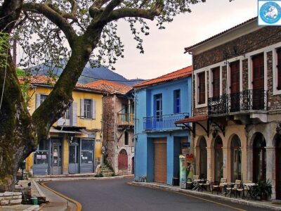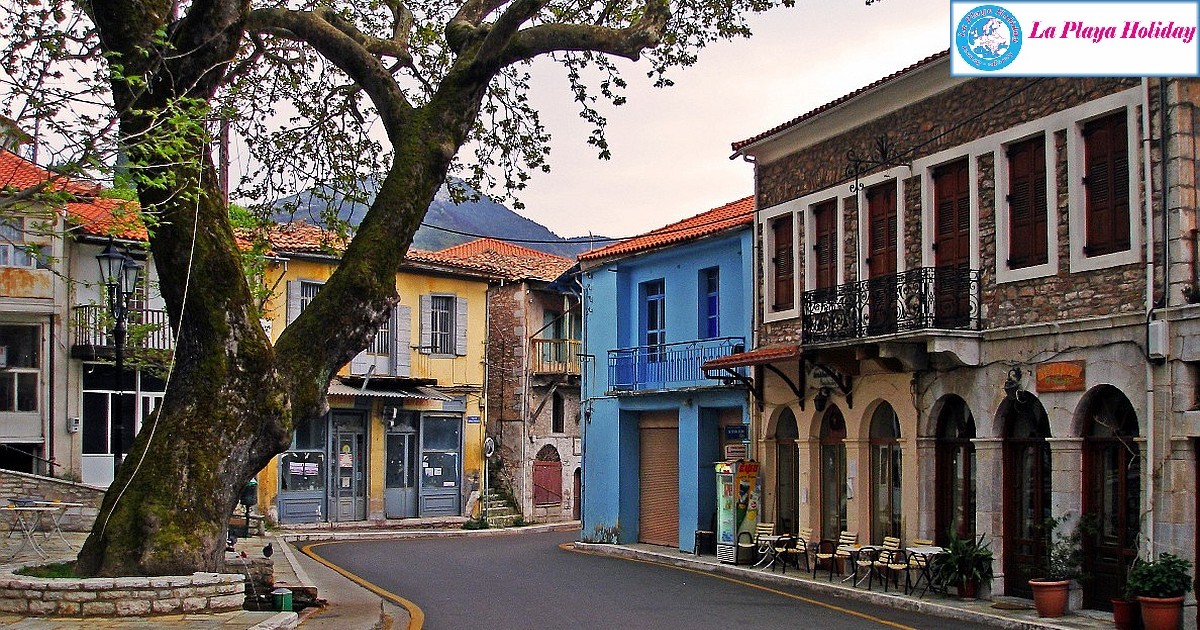 Αξιοθέατα: Τρανή Βρύση (1724, παλαιότερη της Πελοποννήσου), Ιστορική Βιβλιοθήκη, πέτρινα αρχοντικά, πλατεία με πλατάνια