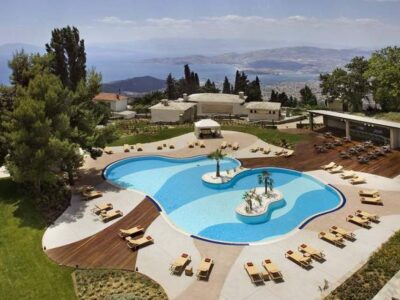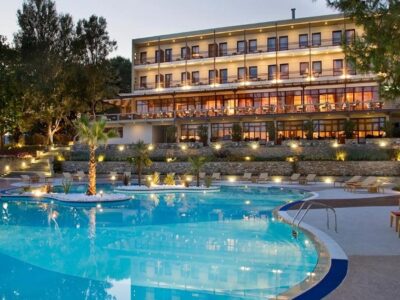 Το Xenia Palace Portaria είναι ένα από τα πιο αναγνωρίσιμα ξενοδοχεία της Θεσσαλίας — όχι τυχαία. Βρίσκεται μέσα στο χωριό της Πορταριάς, ψηλά στις πλαγιές του Πηλίου, και από τα δωμάτια, την πισίνα και το εστιατόριό του ανοίγεται μια από τις ομορφότερες θέες της χώρας: ολόκληρος ο Παγασητικός κόλπος, ο Βόλος απλωμένος κάτω σου σαν μακέτα, και το «βουνό των Κενταύρων» να σε πλαισιώνει από παντού.