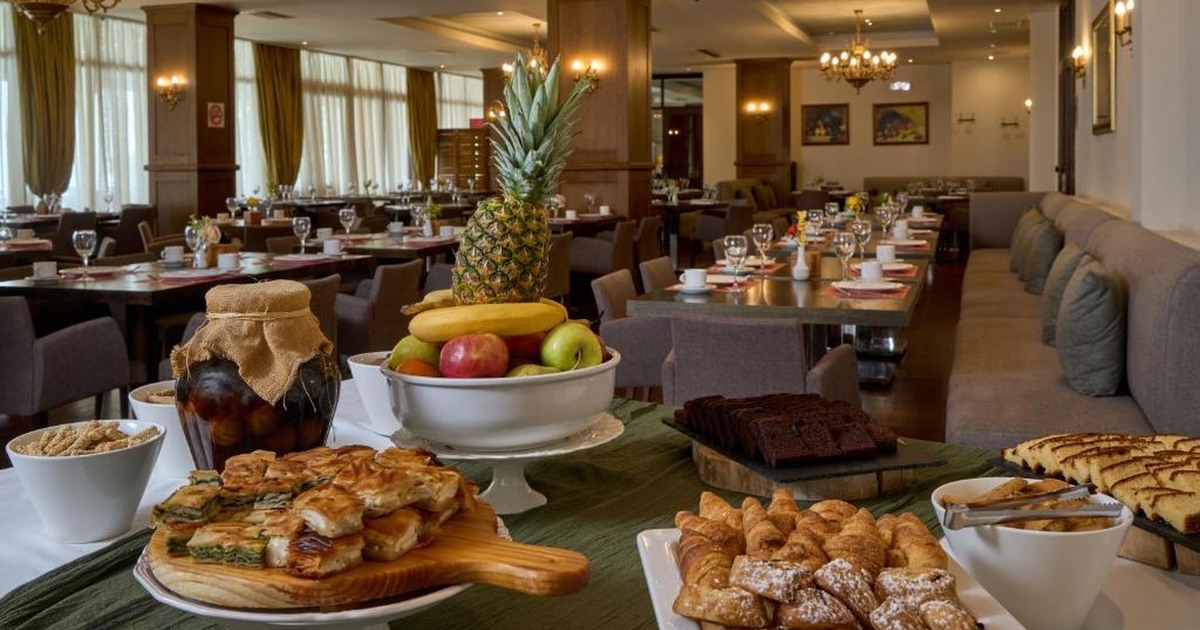 Το πρωινό buffet είναι από τα πιο συχνά επαινούμενα στοιχεία του ξενοδοχείου από επισκέπτες: πλούσιο, με σπιτικές πίτες, χαλβά, χειροποίητα τοπικά προϊόντα και άφθονες επιλογές για κάθε προτίμηση — ακριβώς αυτό που χρειάζεται ένα γκρουπ για να ξεκινήσει δυναμικά τη 2η μέρα. Το δείπνο σερβίρεται επίσης σε μπουφέ, με θέα που κάνει κάθε τραπέζι να μοιάζει με τραπέζι εστιατορίου. Δωρεάν πάρκινγκ μεγάλο — πολύτιμο σε χωριό που η στάθμευση είναι σταθερά πρόβλημα — και δωρεάν Wi-Fi σε όλους τους χώρους.