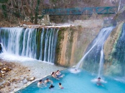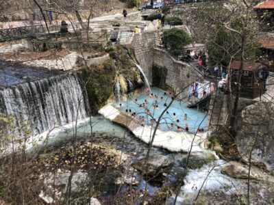 Σε χαράδρα με πλατάνια, τα ιαματικά νερά αναβλύζουν σταθερά έως ~37°C, δημιουργώντας θερμοπόταμο, εξωτερικές πισίνες, φυσικούς καταρράκτες και εσωτερικές εγκαταστάσεις σπα για χαλάρωση στην καρδιά του χειμώνα. Οι υποδομές περιλαμβάνουν υδροθεραπευτήρια με ατομικές/ομαδικές πισίνες, χαμάμ και μια μεγάλη εξωτερική πισίνα, που επιτρέπουν «ζεστή» εμπειρία ακόμη και σε χαμηλές θερμοκρασίες. Φέρτε μαγιό, πετσέτα, σαγιονάρες και μικρό νεσεσέρ· το pairing με γεύμα σε τοπική ταβέρνα δυναμώνει την εκδρομική γεύση της ημέρας.[13][14][5][3]