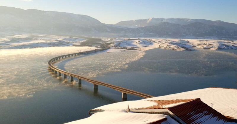 Φωτογραφική στάση στη Γέφυρα Σερβίων στη Λίμνη Πολυφύτου: εμβληματικό τεχνικό έργο 1.372 μ. που άλλαξε το τοπίο του Αλιάκμονα, ιδανικό για σύντομες λήψεις με χειμωνιάτικο φως.