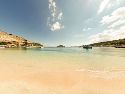 - Παραλία: Μικρός αμμώδης κόλπος με βραχώδες υπόστρωμα, τυρκουάζ νερά
