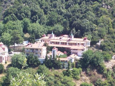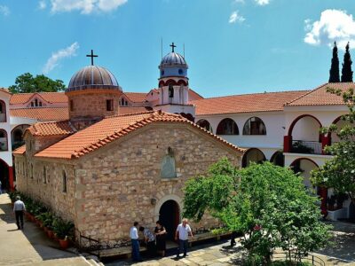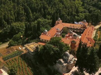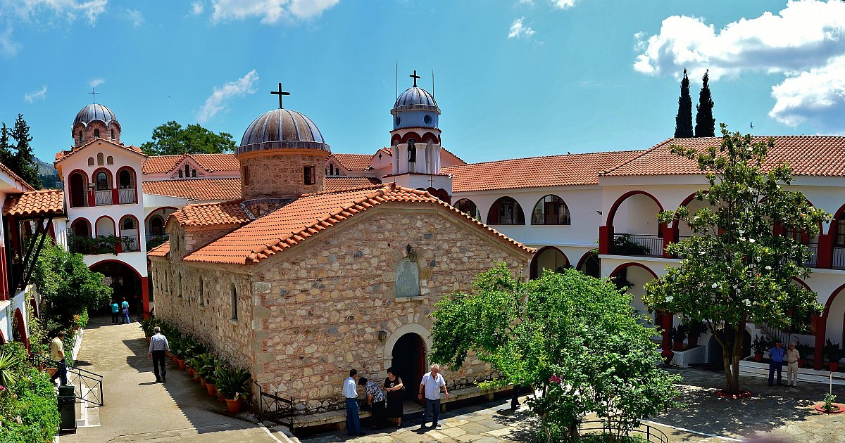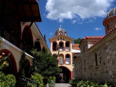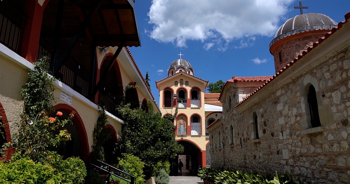 Ο χώρος εντυπωσιάζει από πρώτη ματιά: η μονή εδράζεται ανάμεσα σε δέντρα που φτάνουν ψηλά, με τα κτίσματά της να αναδύονται από το πράσινο σαν να ανήκουν από πάντα εκεί. Το εσωτερικό του καθολικού κρύβει βυζαντινές τοιχογραφίες και εικόνες σε σκηνικό γαλήνης που αντιστρατεύεται τη βιασύνη — και το άρωμα του καπνισμένου λιβανιού αναμεμειγμένο με τη μυρωδιά του νωπού βουνού είναι από μόνο του εμπειρία.