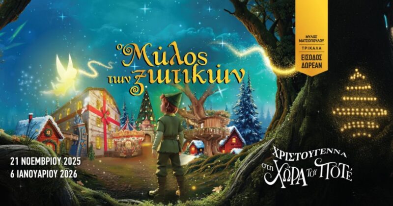 Ο Μύλος Ματσόπουλου ανοίγει για 14η χρονιά και φέτος «ταξιδεύει» στη Χώρα του Ποτέ, με ενιαίο παραμυθένιο storytelling εμπνευσμένο από Πίτερ Παν, Τίνκερμπελ και Κάπτεν Χουκ σε σκηνές, διαδρομές και θεματικά σπίτια. Η σεζόν 2025–26 διαρκεί 21 Νοεμβρίου 2025 έως 6 Ιανουαρίου 2026, καθημερινά 10:00–22:00, με δωρεάν είσοδο και πλούσιο ημερήσιο πρόγραμμα στην κεντρική σκηνή. Ο Δήμος Τρικκαίων έχει ανακοινώσει αναβαθμίσεις, νέες κατασκευές και επέκταση χώρων για καλύτερη ροή σε περιόδους αιχμής.